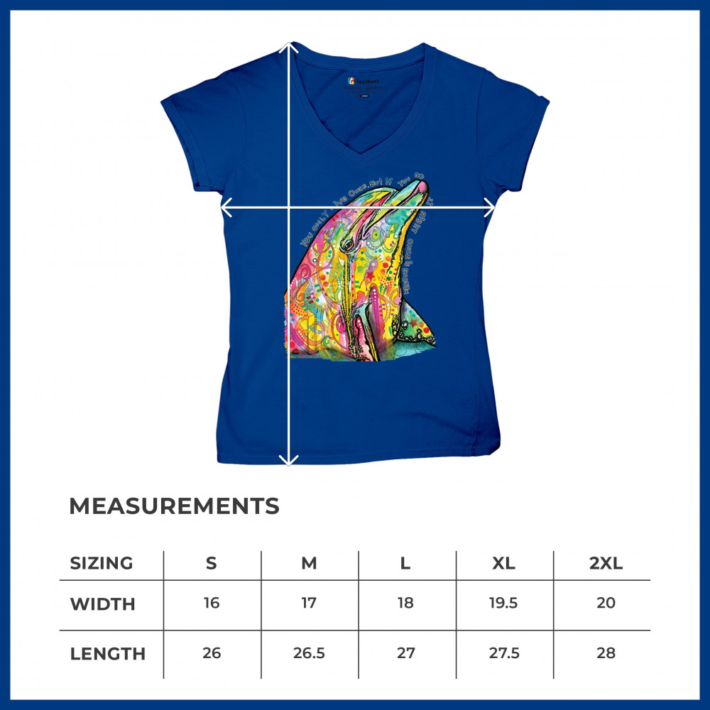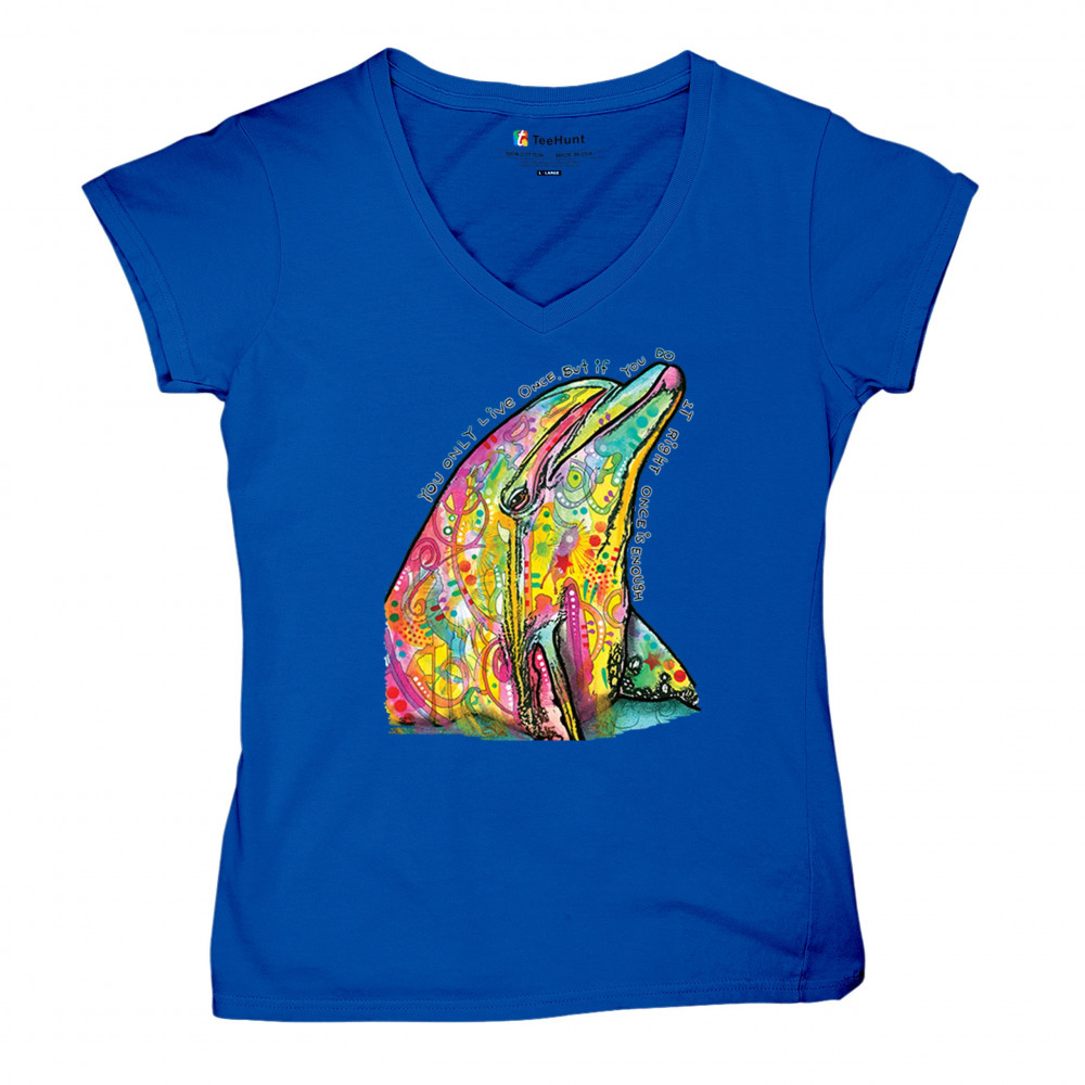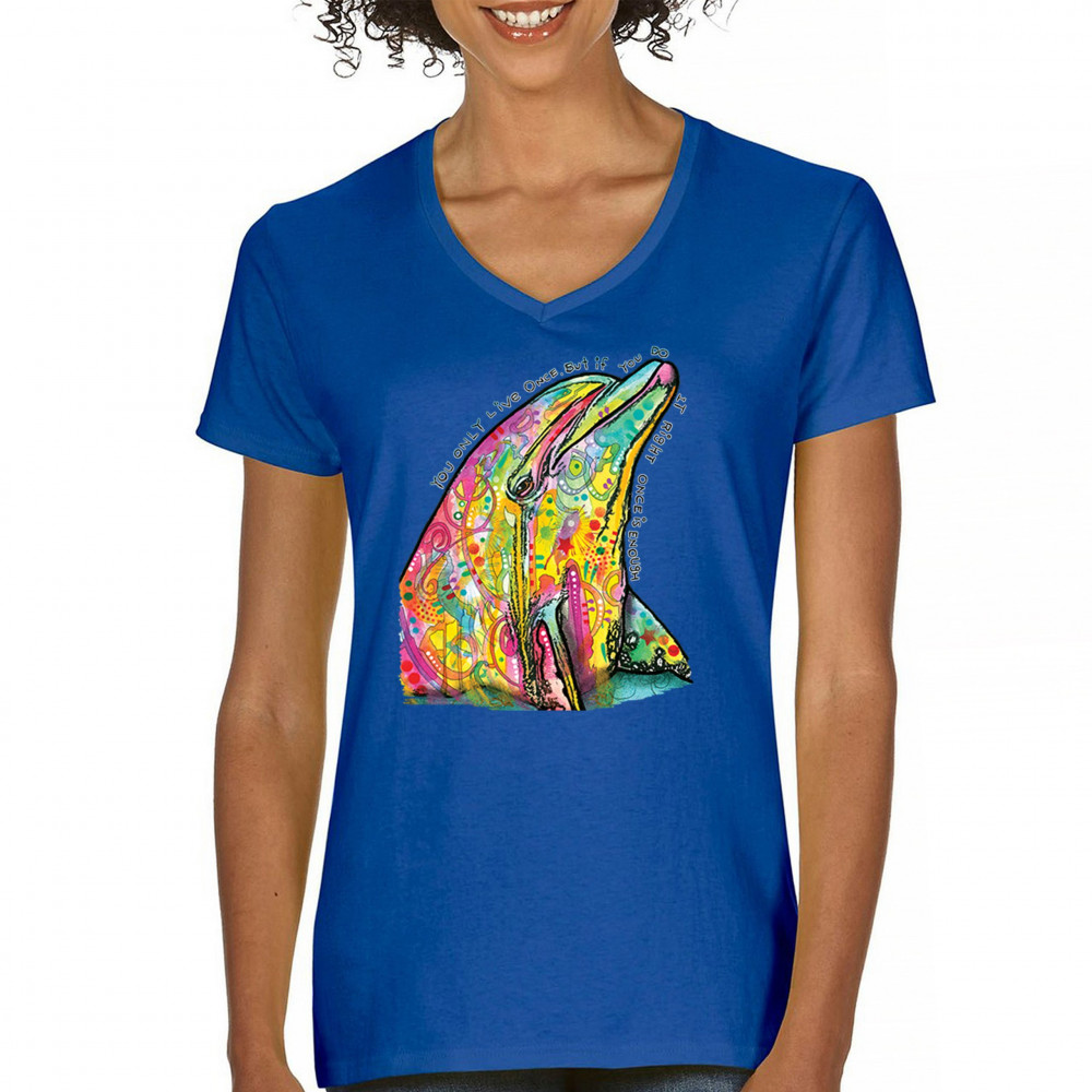 YOU ONLY LIVE ONCE women's v-neck t-shirt cute neon dolphin dean russo tee royal blue