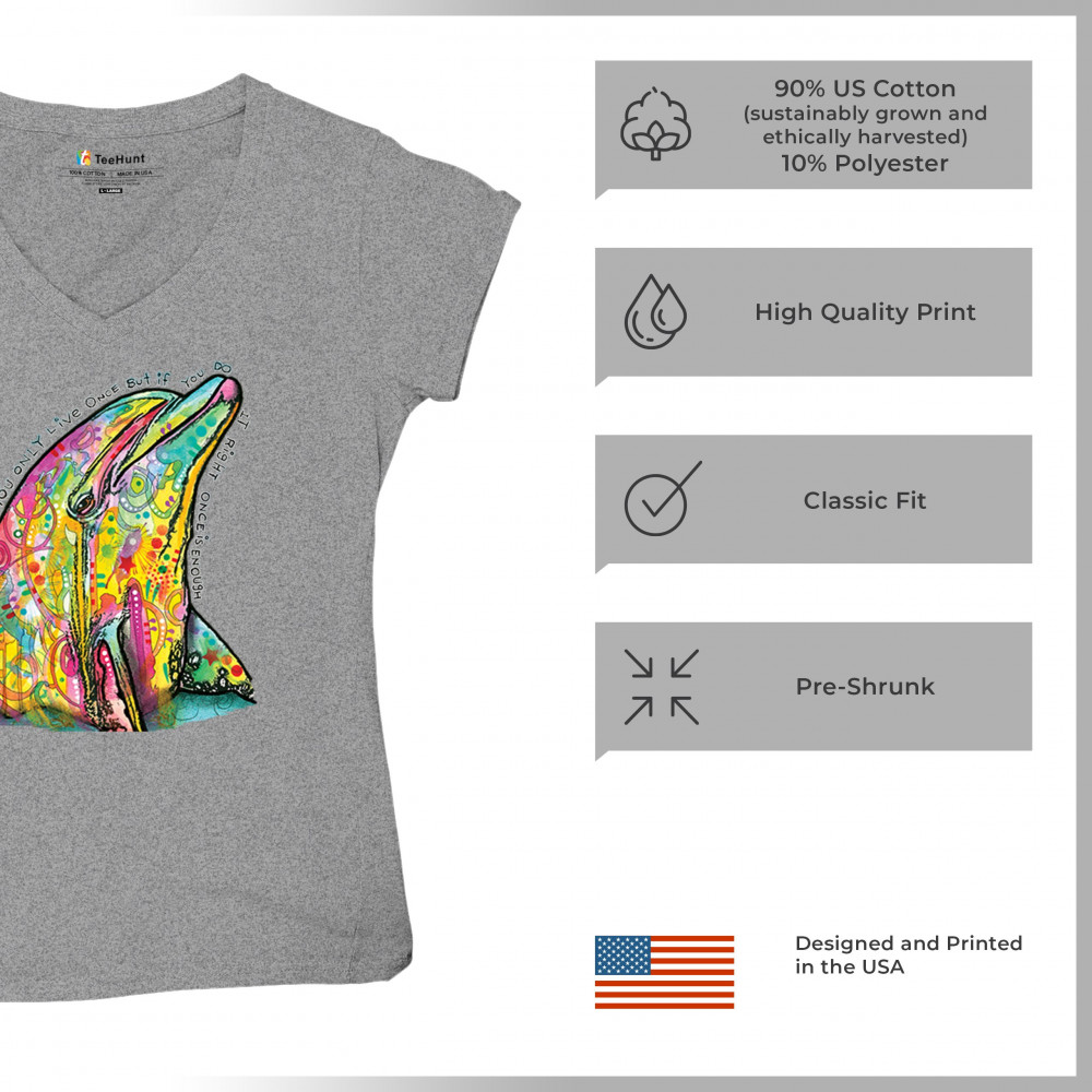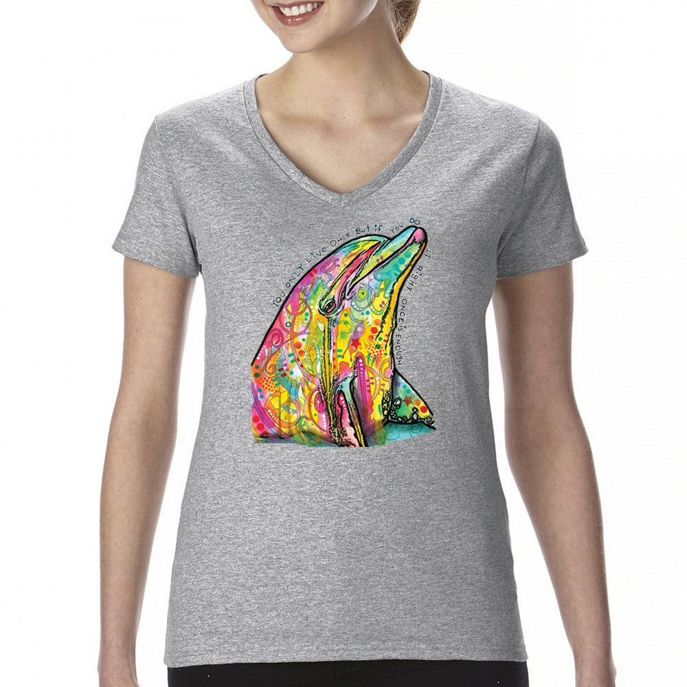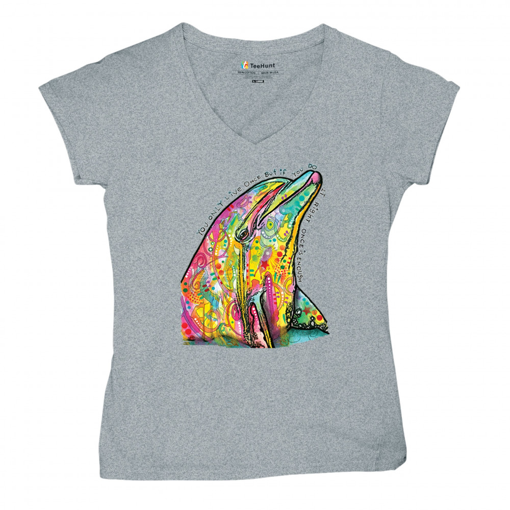 YOU ONLY LIVE ONCE women's v-neck t-shirt cute neon dolphin dean russo tee gray