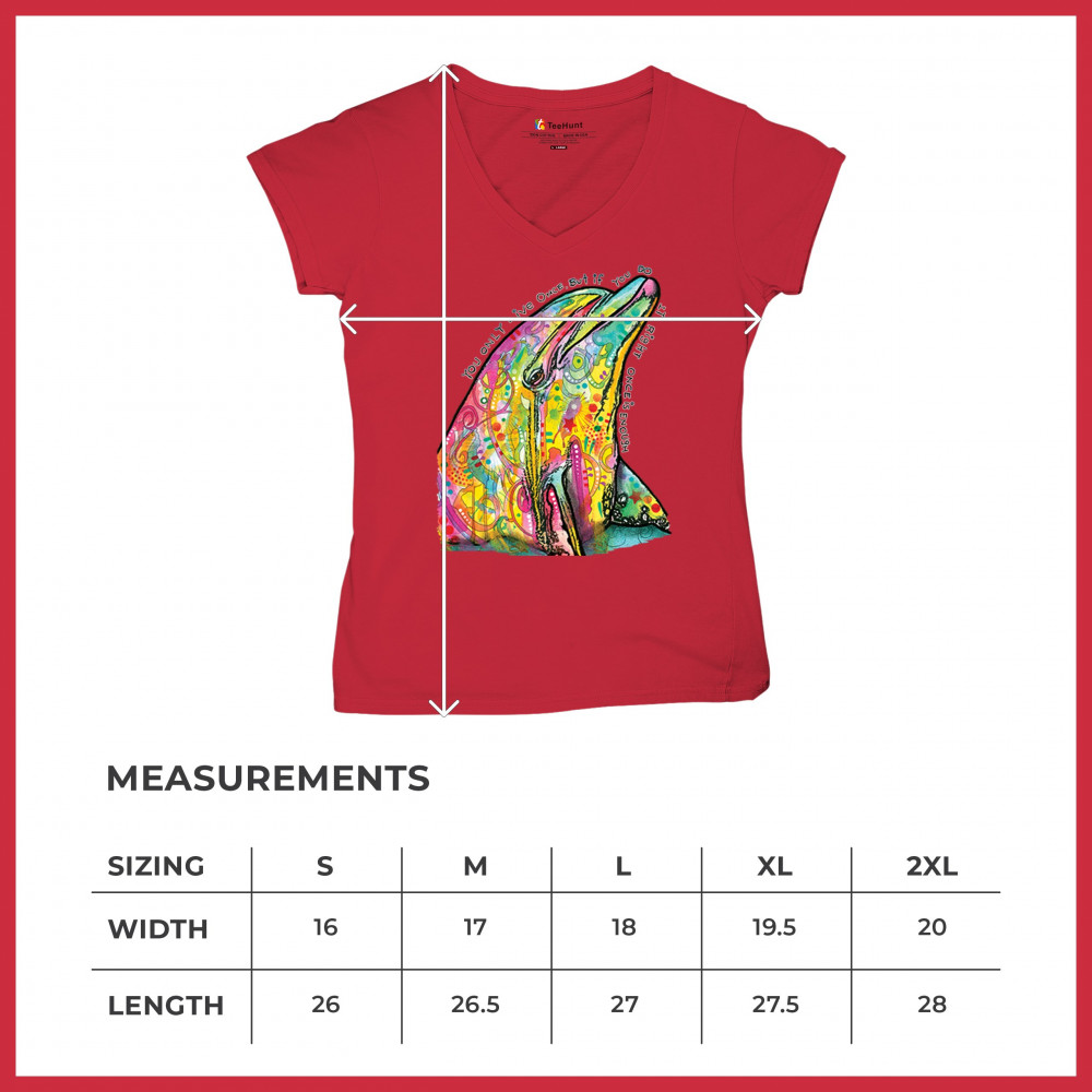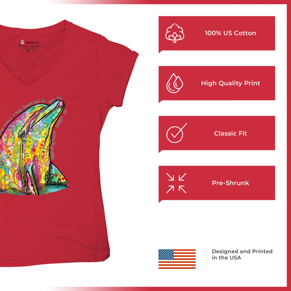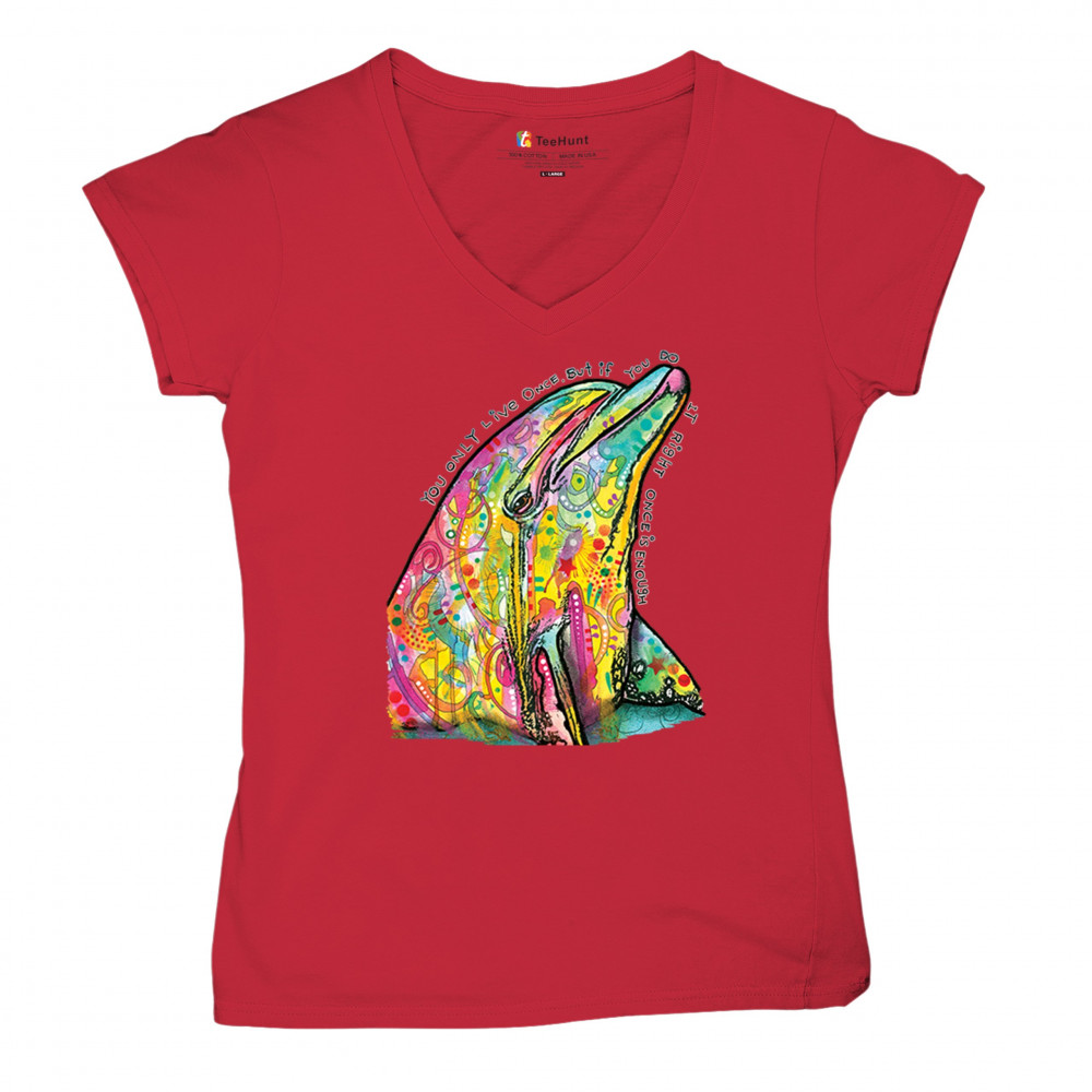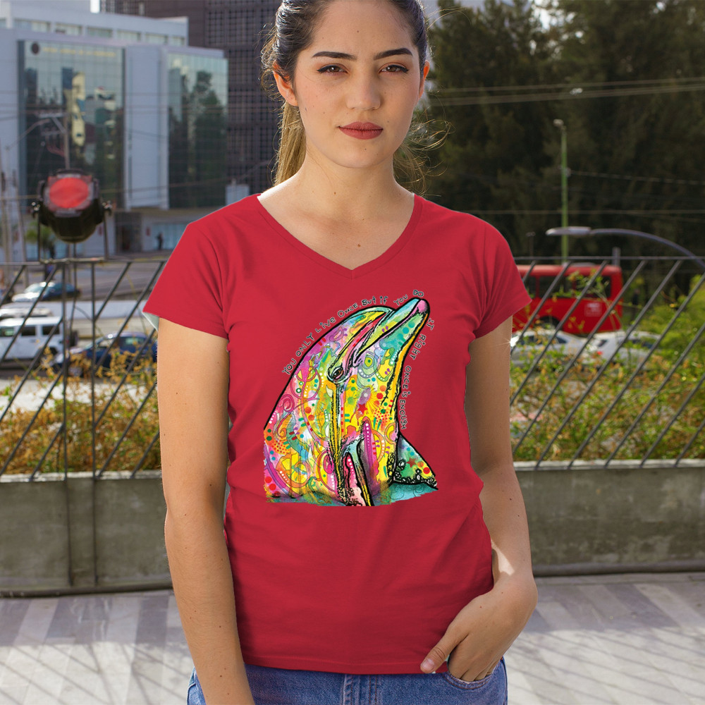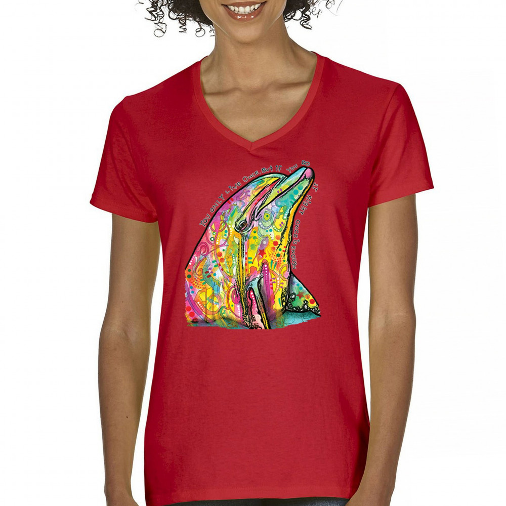 YOU ONLY LIVE ONCE women's v-neck t-shirt cute neon dolphin dean russo tee red