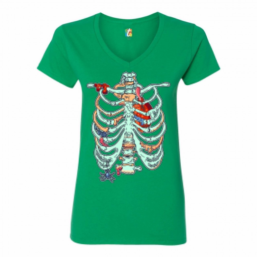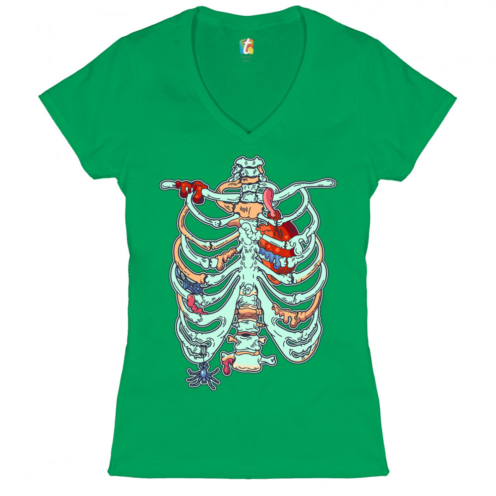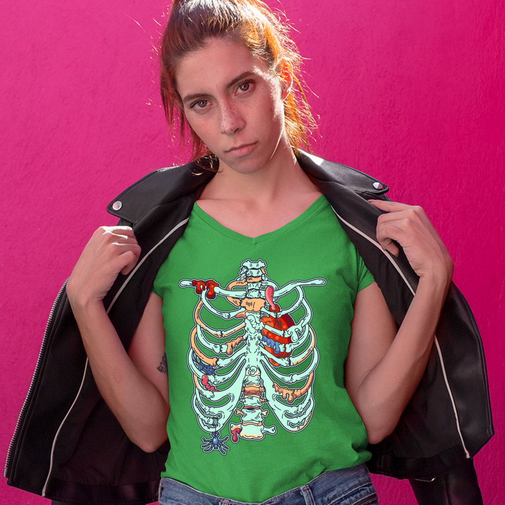 ZOMBIE RIB CAGE women's v-neck t-shirt all hallows' eve halloween skeleton tee green