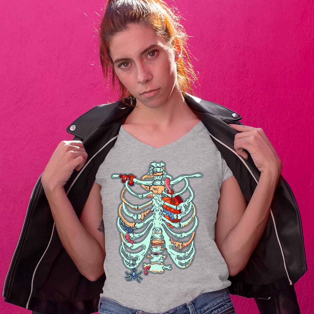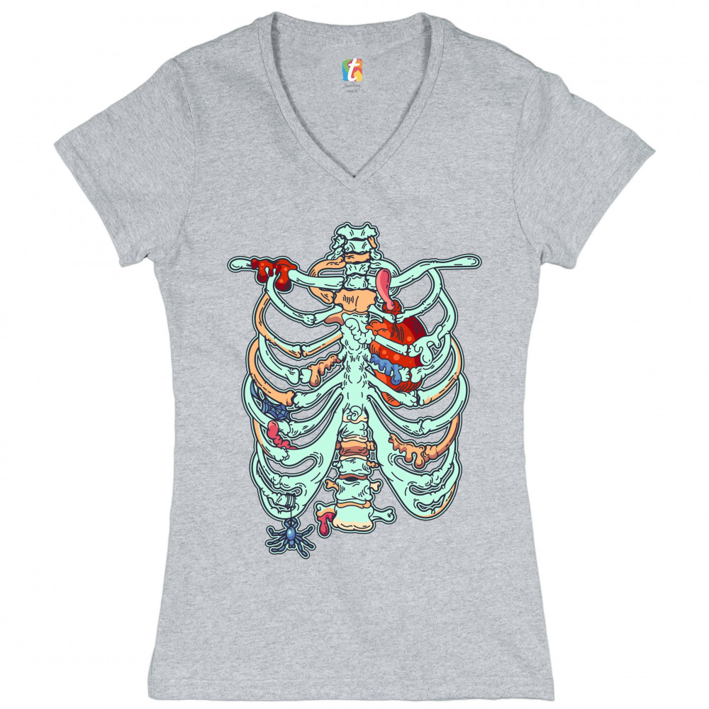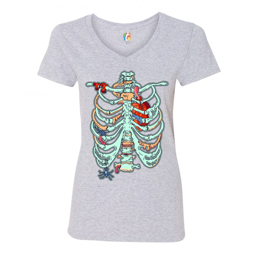 ZOMBIE RIB CAGE women's v-neck t-shirt all hallows' eve halloween skeleton tee gray