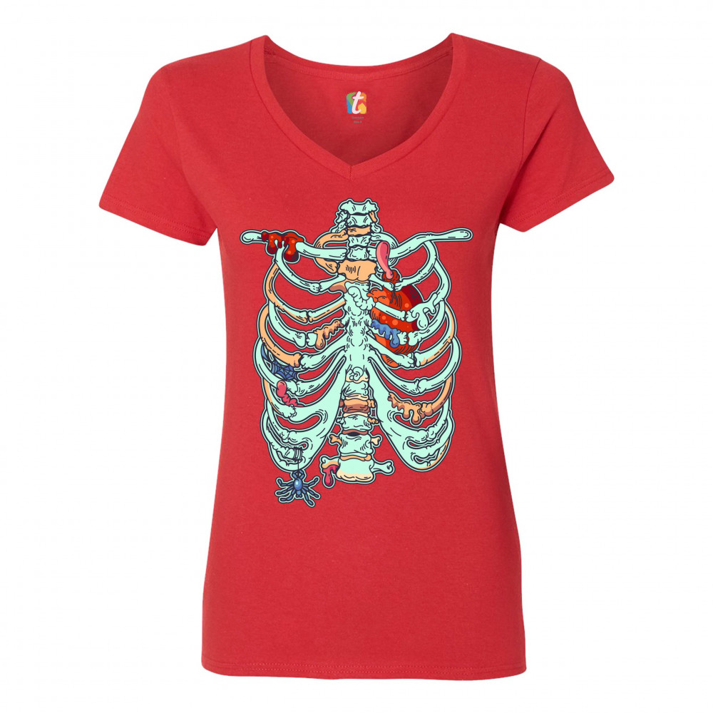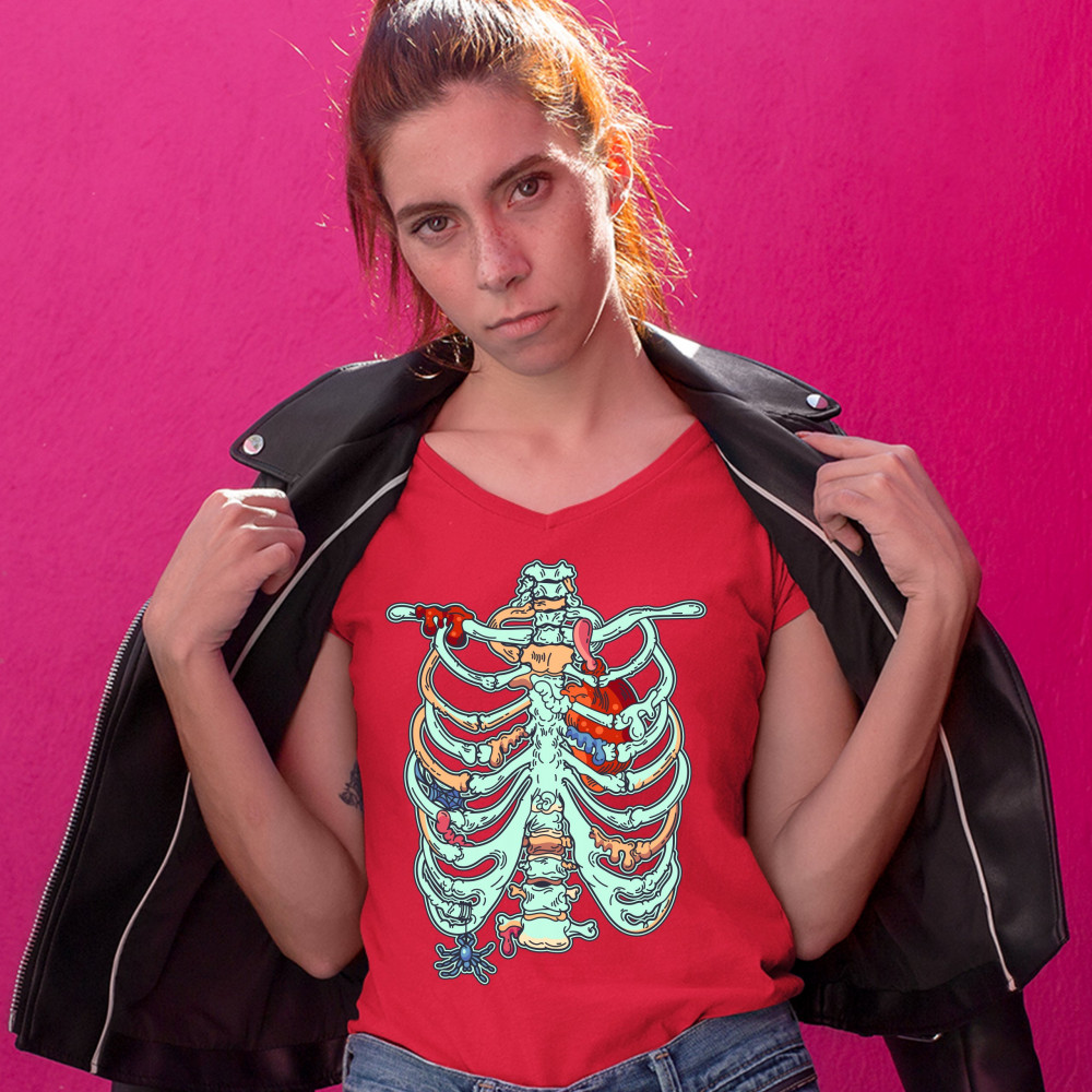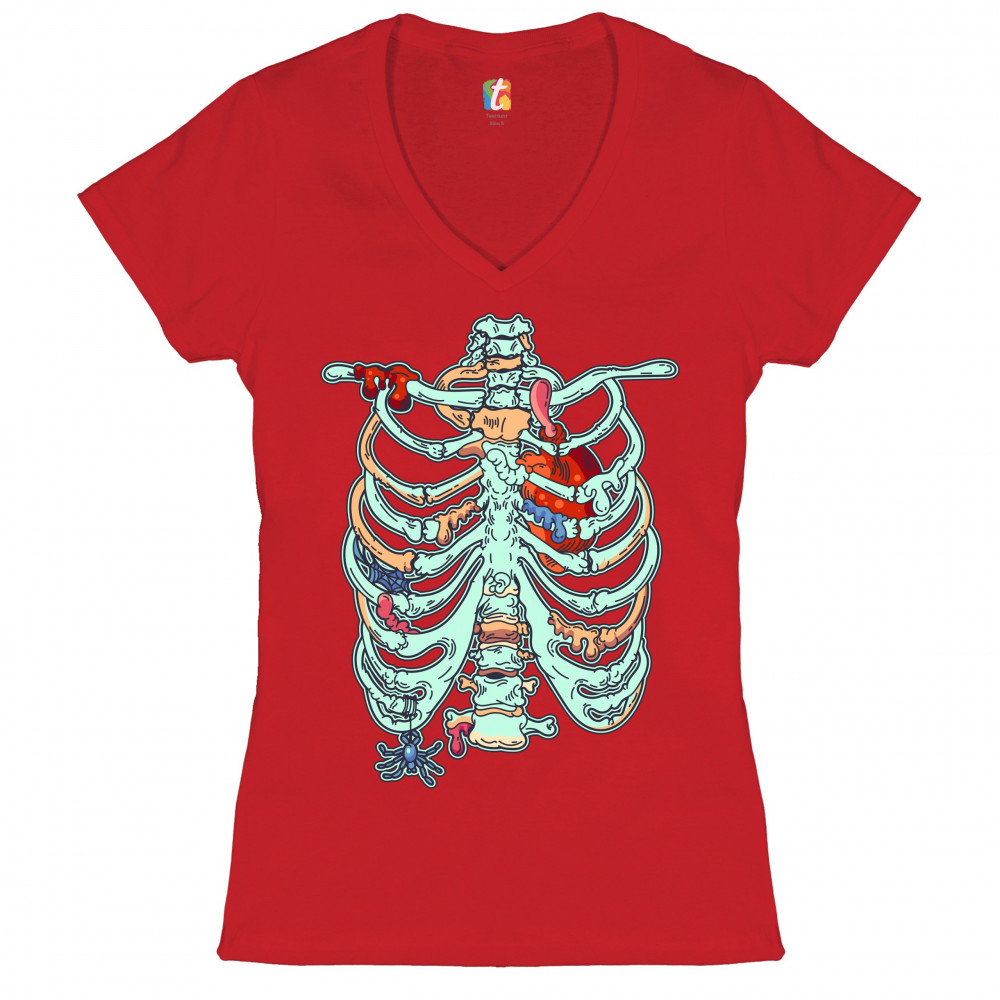 ZOMBIE RIB CAGE women's v-neck t-shirt all hallows' eve halloween skeleton tee red