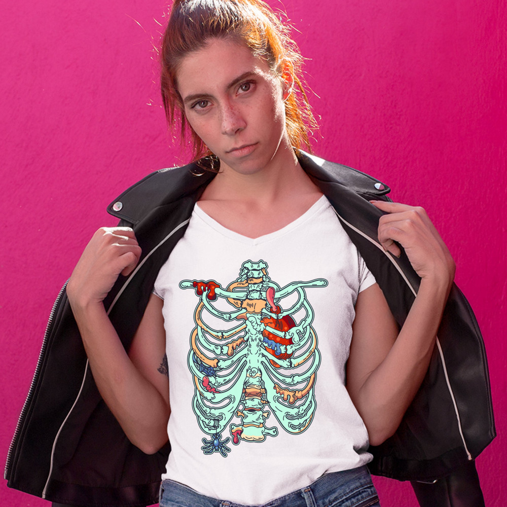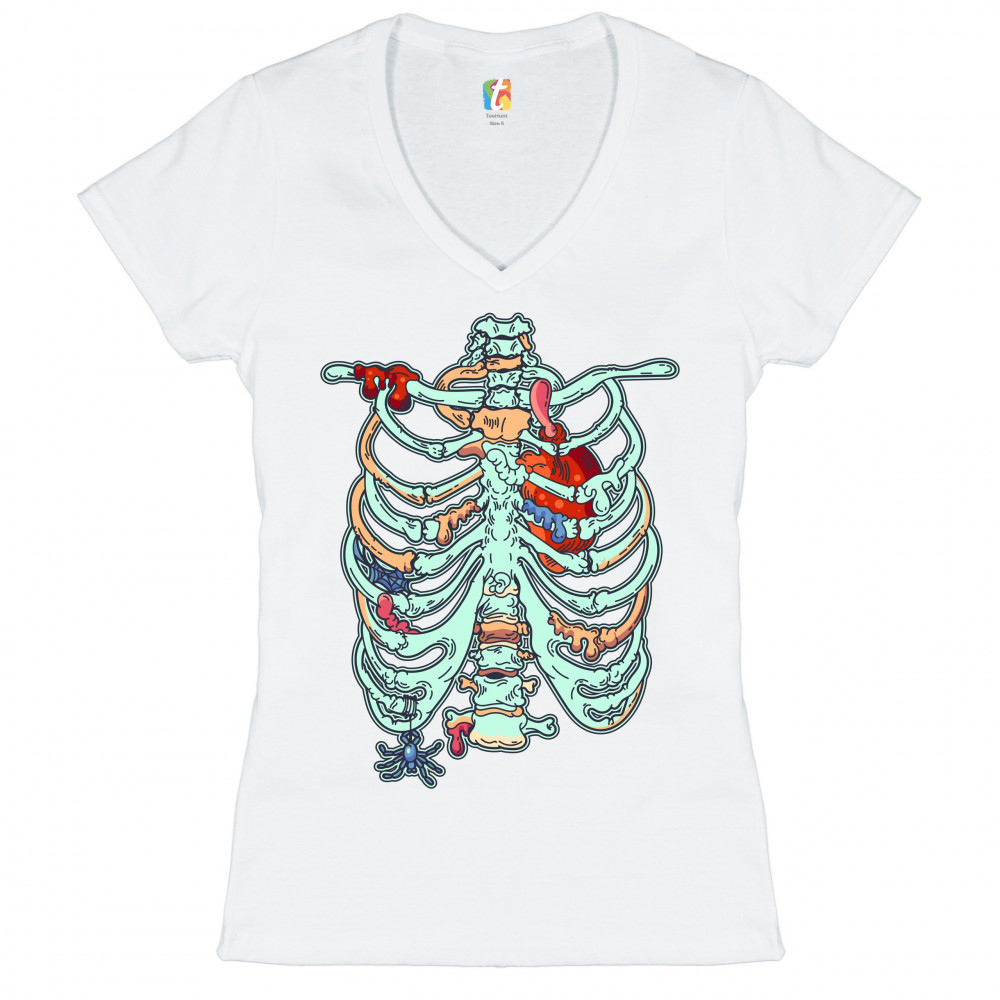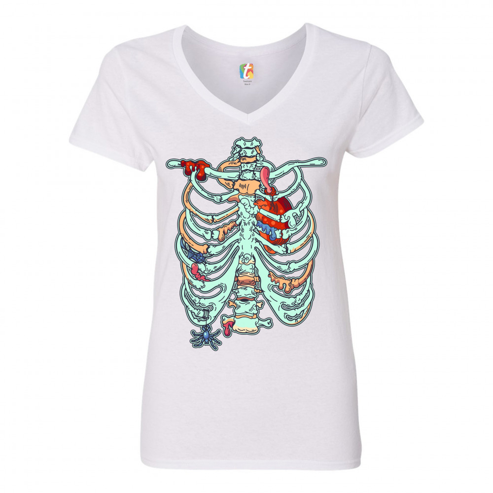 ZOMBIE RIB CAGE women's v-neck t-shirt all hallows' eve halloween skeleton tee white
