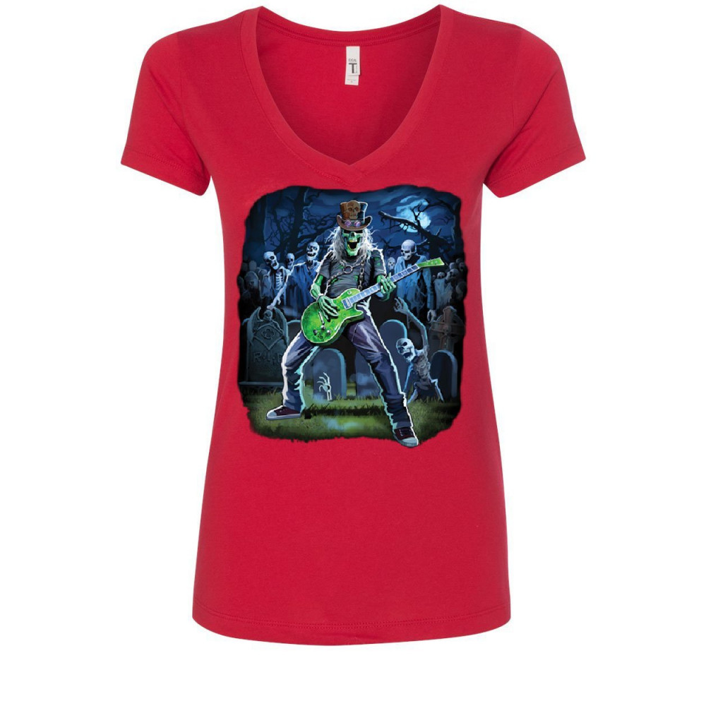 ZOMBIE ROCK women's v-neck t-shirt heavy death metal music skull hard rock red